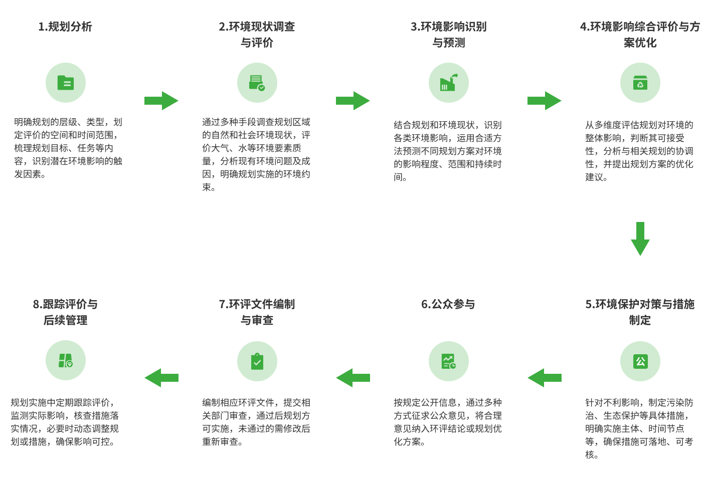 流程如下:分析研判、商务洽谈、现场踏勘、第一次公示、现场调查与监测、规划分析、环境目标与评价指标确定、环境影响预测、编制报告、第二次公示、报告内审、报告评审、获取审查意见。